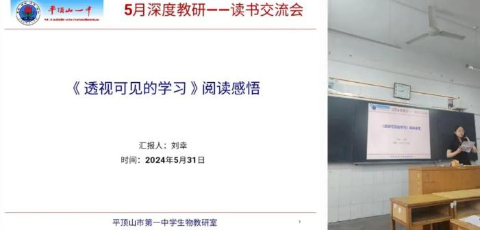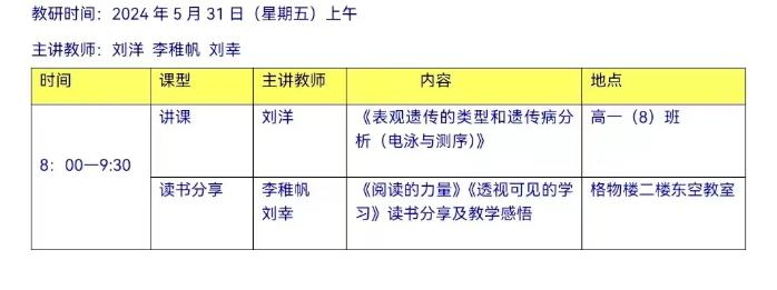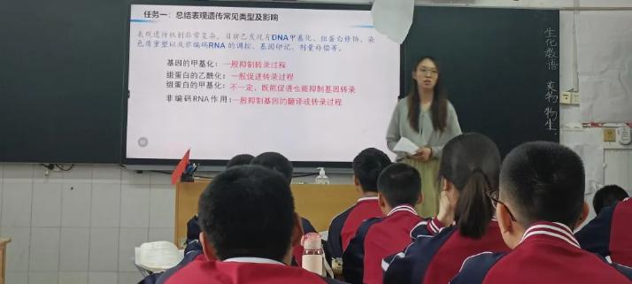 教有所得,研有所获,学习是最美的遇见,成长是最美的风景。为进一步提高教师教学能力,促进专业素养与技能的提升,5月31日上午,第十届骨干教师培训对象在平顶山一中西校区格物楼二楼活动教室举行第三次线下教研活动,活动由高中生物名师工作室主持人张春阳主持。本次研修活动的分为两项:一是由骨干教师培养对象刘洋老师讲授示范课——《表观遗传的类型和遗传病分析(电泳与检测)》;二是分别由市一中李稚帆老师和刘幸老师分享教学心得及《阅读的力量》《透视可见的学习》这两本书的读书感悟。