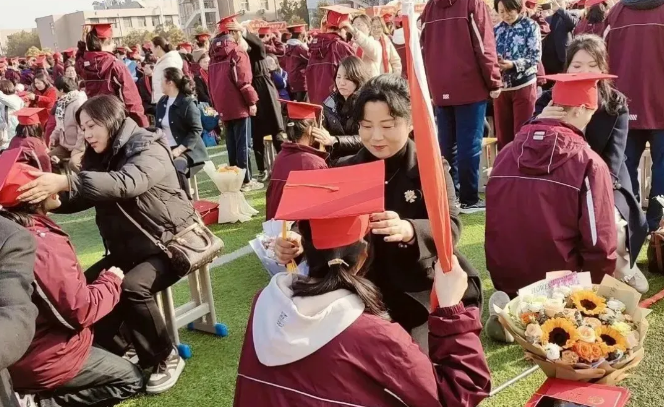 伴随着内心的感动和欣慰,家长们为孩子们佩戴上象征光明前途、火红未来的成人帽,并行拨穗礼,祝福孩子们学有所成,收获将至。